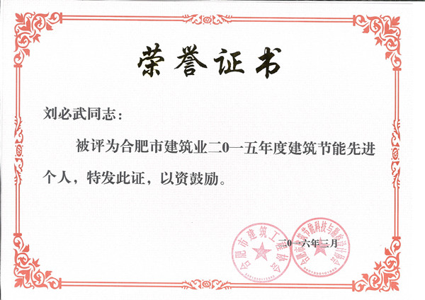 大會現(xiàn)場宣讀了有關表彰通報,安徽威耐得新型建材有限公司董事長劉必武榮獲“合肥市建筑業(yè)2015年度建筑節(jié)能先進個人”榮譽稱號,省市領導親自頒發(fā)榮譽證書并合影。建筑節(jié)能先進企業(yè)和先進個人的評選活動 ,旨在弘揚節(jié)能減排
